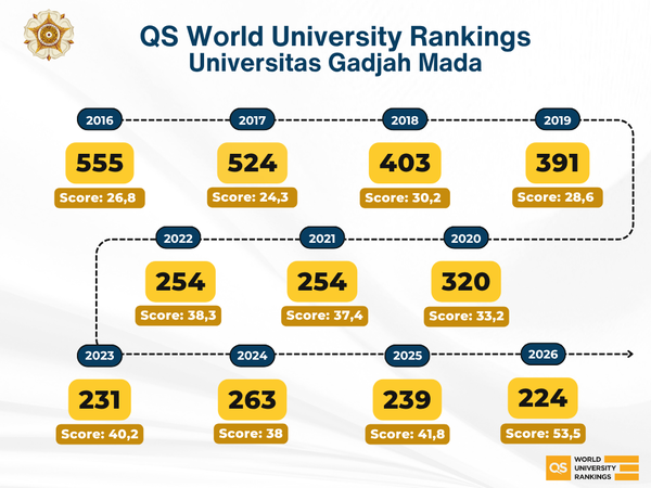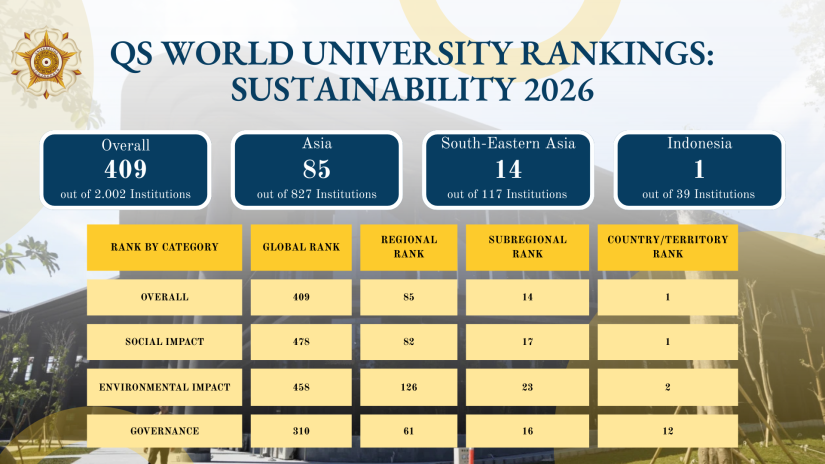 UGM kembali menunjukkan peran pentingnya dalam mendukung pembangunan berkelanjutan melalui capaian yang diraih dalam pemeringkatan QS Sustainability 2026. Berdasarkan pengumuman resmi pada Selasa, 18 November 2025, UGM berhasil menduduki peringkat pertama secara nasional dengan overall score 72,3. Pada tingkat global, UGM menempati peringkat 409 dari 2.002 institusi.